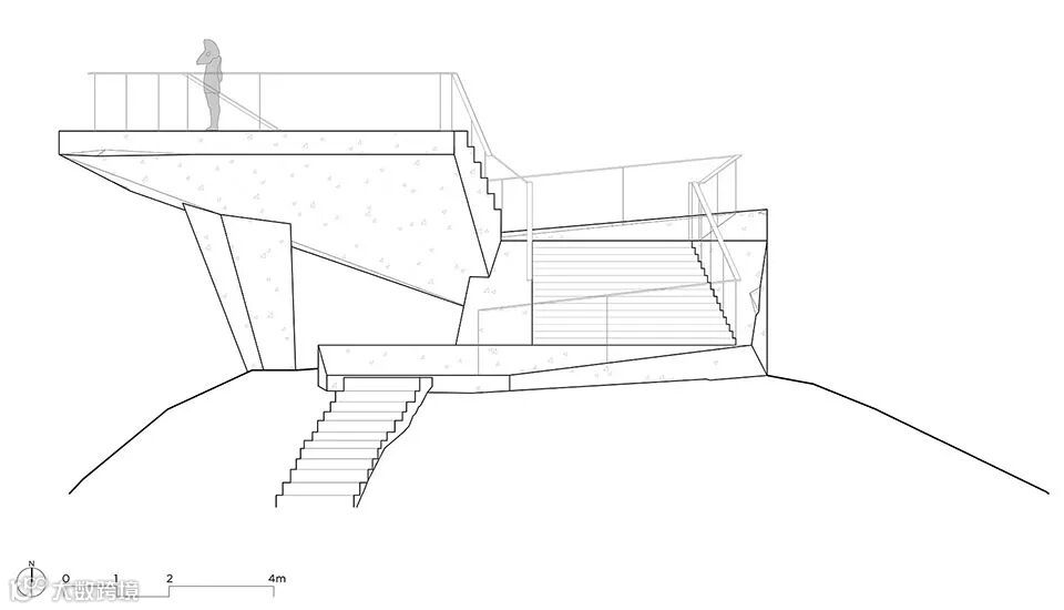 山顶常年强风,设计以现浇混凝土整体浇筑形成重力锚固进行回应,摒弃轻钢结构以抵抗风荷载;缓坡台阶与低矮平台消解风阻,让空间随山势蜿蜒生长。