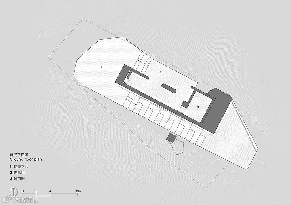 上层石板平台向天际延展,提供360度全景视野;下层嵌入山体的服务空间为登山者提供休憩与庇护。通过“轻介入”的手法,设计保留山脊原貌,通过路径的转折与高差变化,将人工痕迹转化为地景的延续。