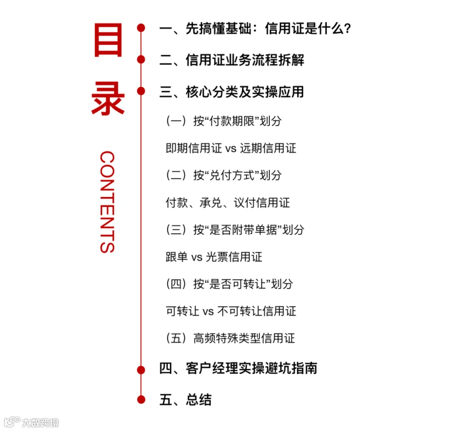 信用证分类维度多,但对公业务中付款期限、兑付方式、是否可转让、用途是客户最关心的维度,也是客户经理需重点掌握的内容。