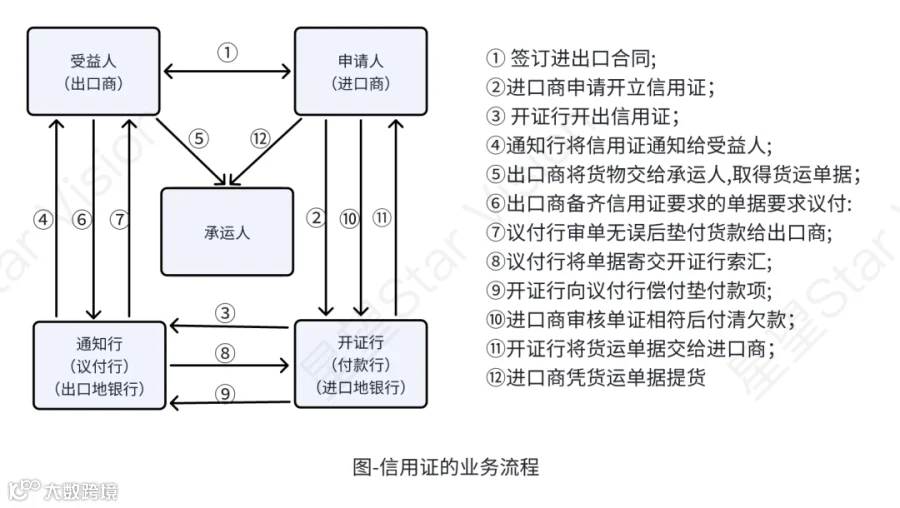 用一个 “进口商 A 通过工行开证给出口商 B,交单行是花旗银行” 的例子来说明: