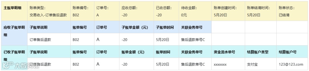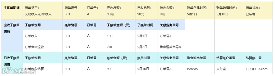 收入主子账单举例:订单A共100元,消费者于5月1日下单并支付成功,5月2日售中退款成功10元(售中退款单号B),5月10日确认收货商家收到剩余90元货款,5月20日售后退款成功20元(售后退款单号C),且假设该商家未使用提前回款产品,则主子账单明细如下: