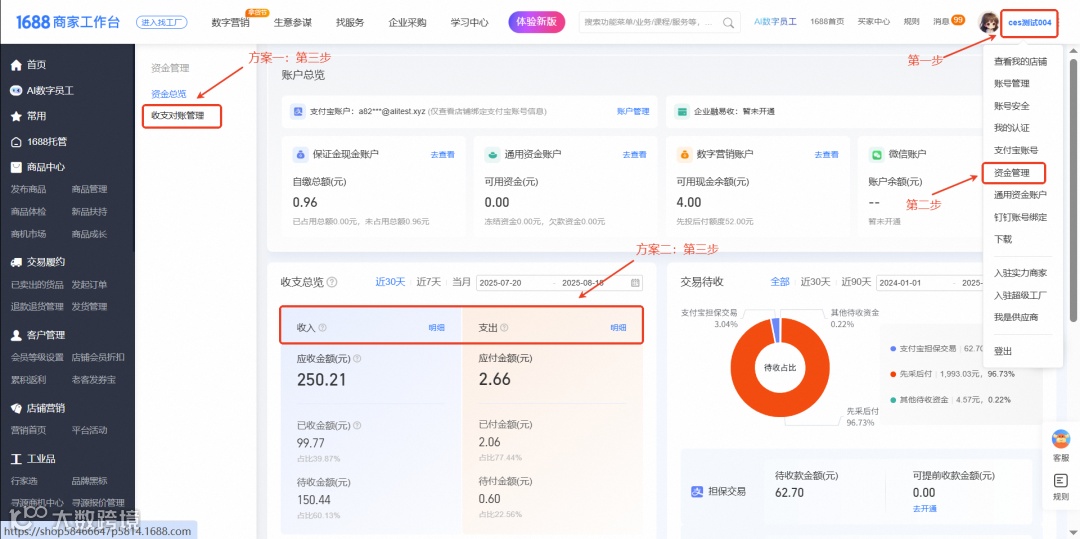 1688 商家旧版工作台-右上角店铺名-资金管理-左侧菜单栏收支对账管理 或 收入明细