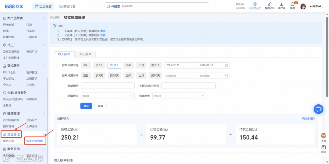 1688 商家新版工作台-资金管理-收支对账管理-收入账单