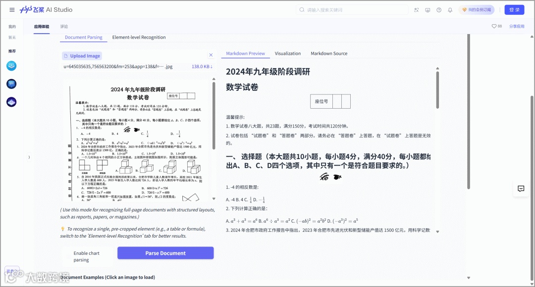试卷识别:不仅文字准确识别了,公式也不在话下,就连排版也相当还原了。这种能力对于教育数字化意义重大——传统 OCR 往往会把公式识别得支离破碎,而 PaddleOCR-VL 能够理解公式的整体结构。