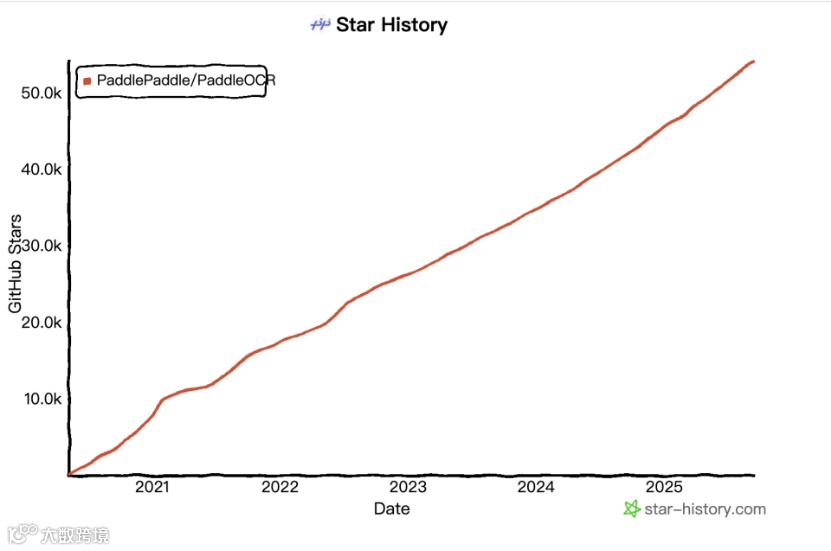 PaddleOCR-VL 模型由百度飞桨 Paddle OCR 团队出品。值得关注的是,PaddleOCR 是 GitHub 社区中唯一一个 Star 数超过 50k 的中国 OCR 项目。开源已 5 年,累计下载量突破 900 万,被超过 5.9k 开源项目直接或间接使用。这个生态影响力,在国内开源项目中确实少见。