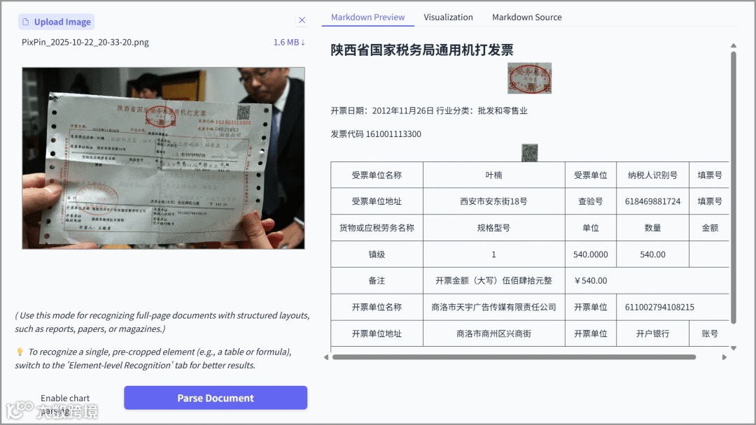 干扰环境下的发票识别:像这种拿在手中,背面字体影响的发票也能正确识别。传统 OCR 遇到背景干扰往往会"抓瞎",而 PaddleOCR-VL 能够区分前景与背景信息。
