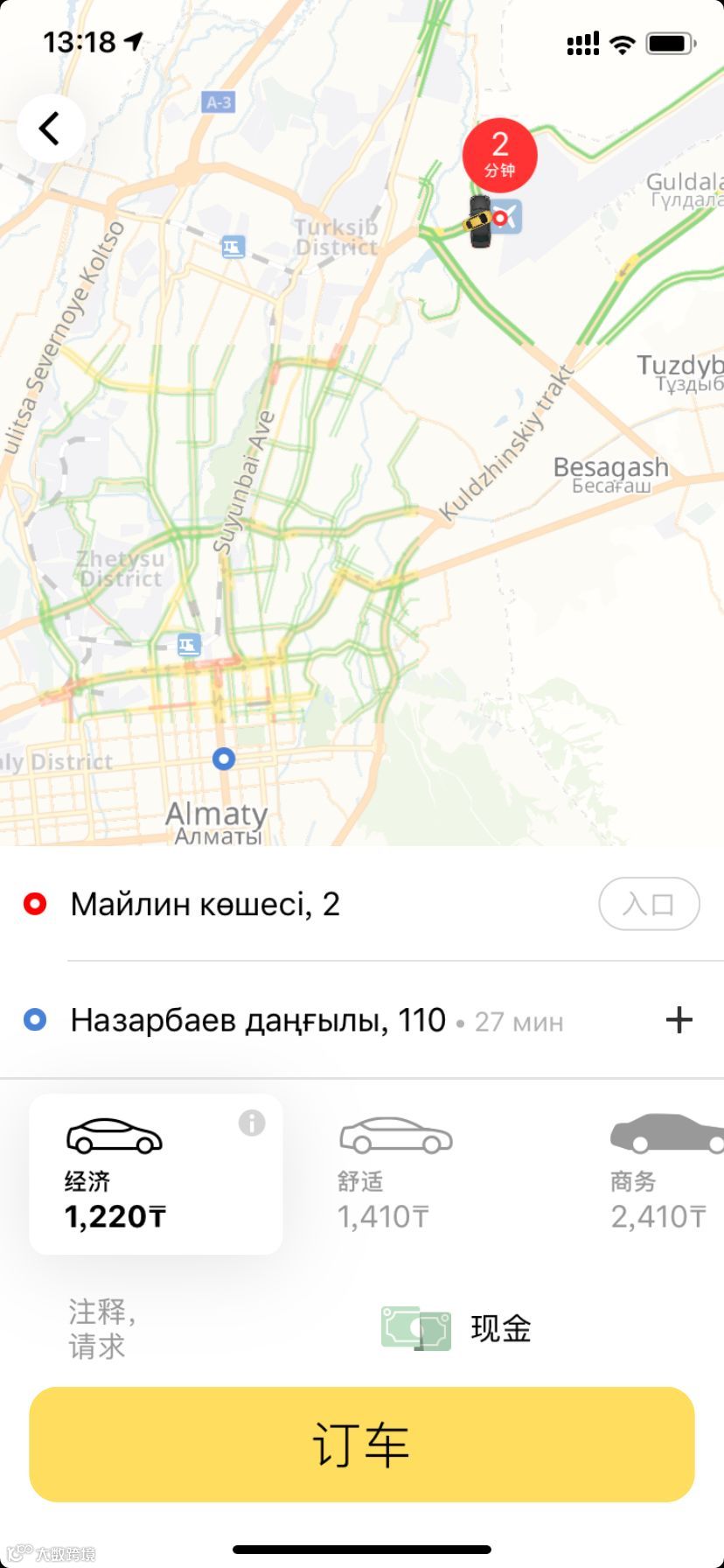 在哈萨克斯坦第二大城市阿拉木图,传统出租车资源相对匮乏,除五星级酒店及Esentai Mall等高端商圈外,街头招手打车极为不便[k]。对于游客或商务人士而言,出行常面临依赖酒店叫车(价格偏高)或等待接驳的困境[k]。