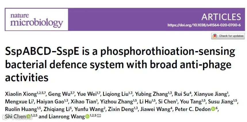 近日,武汉大学药学院王连荣团队在Nature Microbiology上发表了题为SspABCD-SspE is a phosphorothioation-sensing bacterial defence system with broad anti-phage activities的研究论文,报道了SspABCD-SspE组成的一种全新的磷硫酰化限制-修饰系统并对其防御机理进行了深入探究。