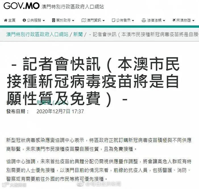 澳门:市民接种新冠疫苗将是自愿性质,且为免费接种