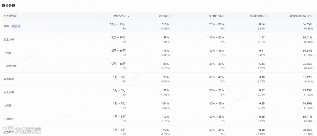 搜索排行是关键词分析的核心入口,重点关注两类信息:一是类目下高速增长的关键词,通常可查看前100至300名榜单;二是相关搜索词拓展,例如“内裤”会细分为“男士内裤”“女士内裤”“一次性内裤”等[k]。