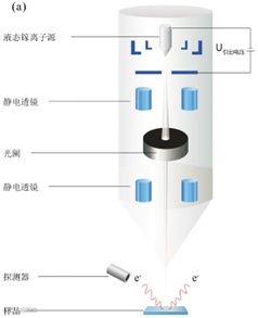离子镜筒的结构示意图如下图所示。目前应用最广泛的是液态镓(Ga)离子源,因为Ga元素具有低熔点、低蒸气压的特点,同时Ga离子易获得高密度束流,可以刻蚀大部分材料。Ga加热后会向下流到钨针尖尖端,由于表面张力和相反方向电场力的作用,Ga会在针尖形成一个尖端半径仅约2 nm的锥形体; 随后,作用在尖端上的巨大电场(>108V/cm)会使Ga原子电离并发射出来。Ga离子束通过静电透镜被聚焦在样品上并进行扫描,与样品发生相互作用,收集产生的各种信号,从而实现对样品的精细加工和显微分析。