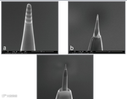 对原子探针样品的制备要求与TEM 薄片样品很接近方法也类似。首先选取感兴趣的取样位置,在两边挖V 型槽,将底部切开后,再用纳米机械手将样品取出。转移到固定样品支座上,用Pt 焊接并从大块样品切断。连续从外到内切除外围部分形成尖锐的针尖。最后将样品用离子束低电压进行最终抛光,消除非晶层,和离子注入较多的区域。