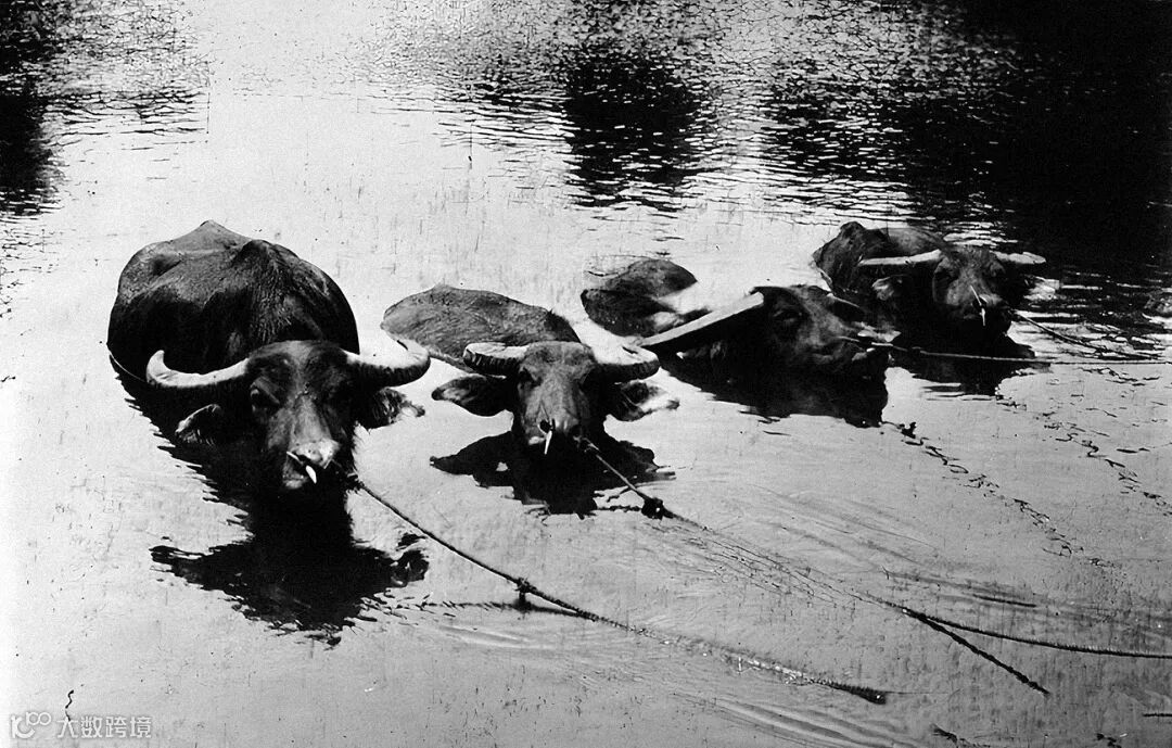 Four water buffaloes in Hangzhou's canal in 1918 . Buffaloes were indispensable farming assistants for peasants in the Jiangnan region