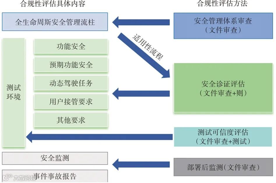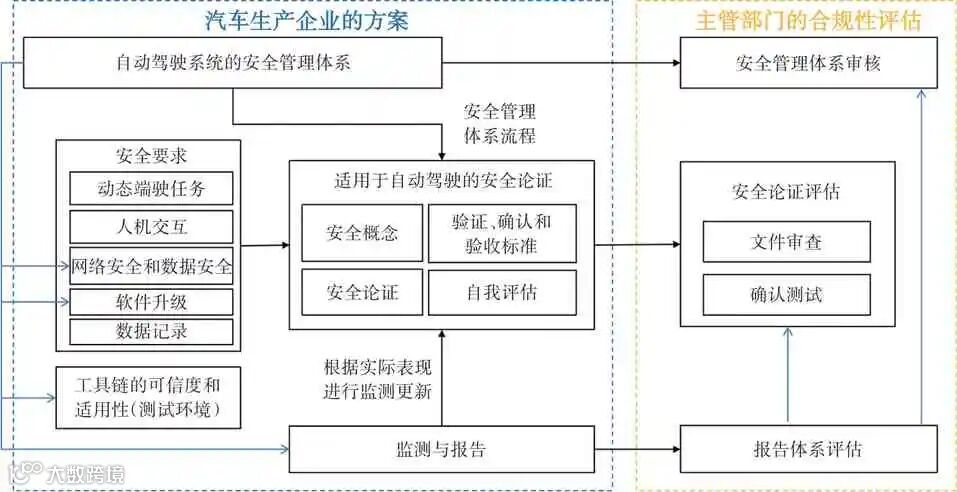 自动驾驶系统合规性评估框架涵盖从设计开发到部署后监测的全生命周期,具体分为企业自评估方、主管部门通过对汽车生产企业的方案进行审核评估两层级评估[65],如图4所示。