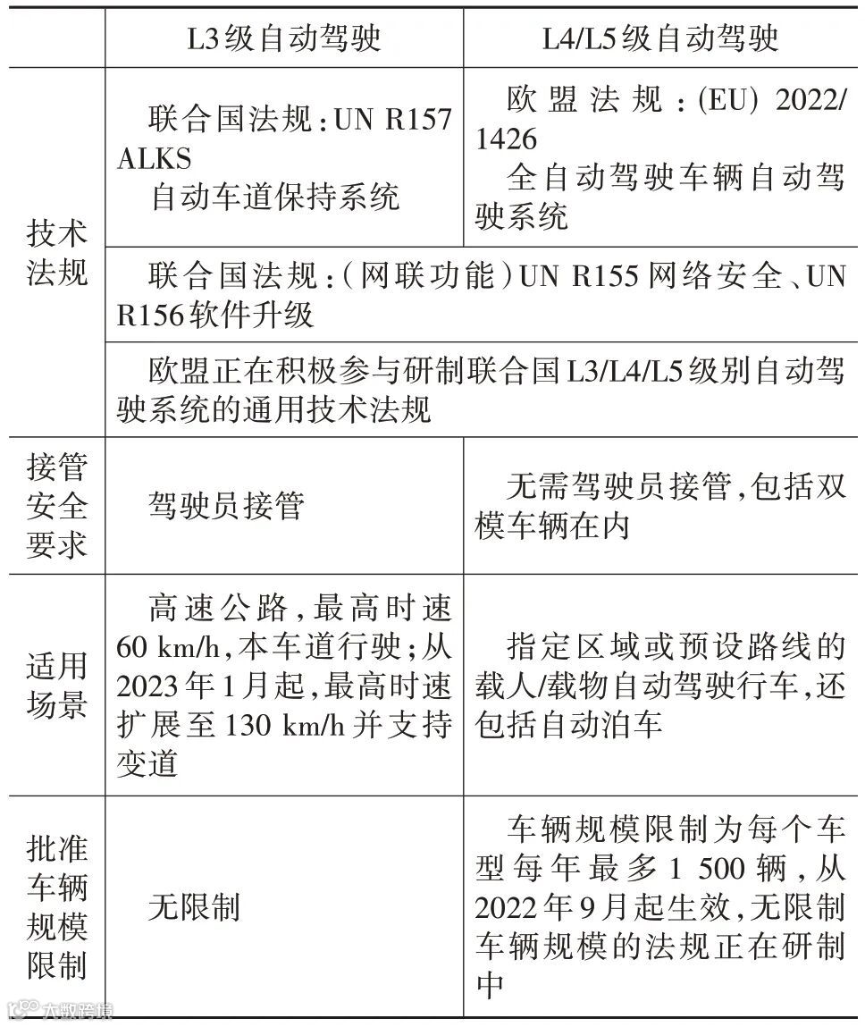 通用安全法规及其引用的技术法规,为有条件自动驾驶和高度自动驾驶汽车及以上自动驾驶汽车制定了法规框架,该框架从技术要求、数据记录、网络安全措施等方面进行规范,确保此类车辆在投放市场前具备足够的安全性和技术成熟度,从而为欧盟自动驾驶汽车的广泛应用铺平道路[20]。