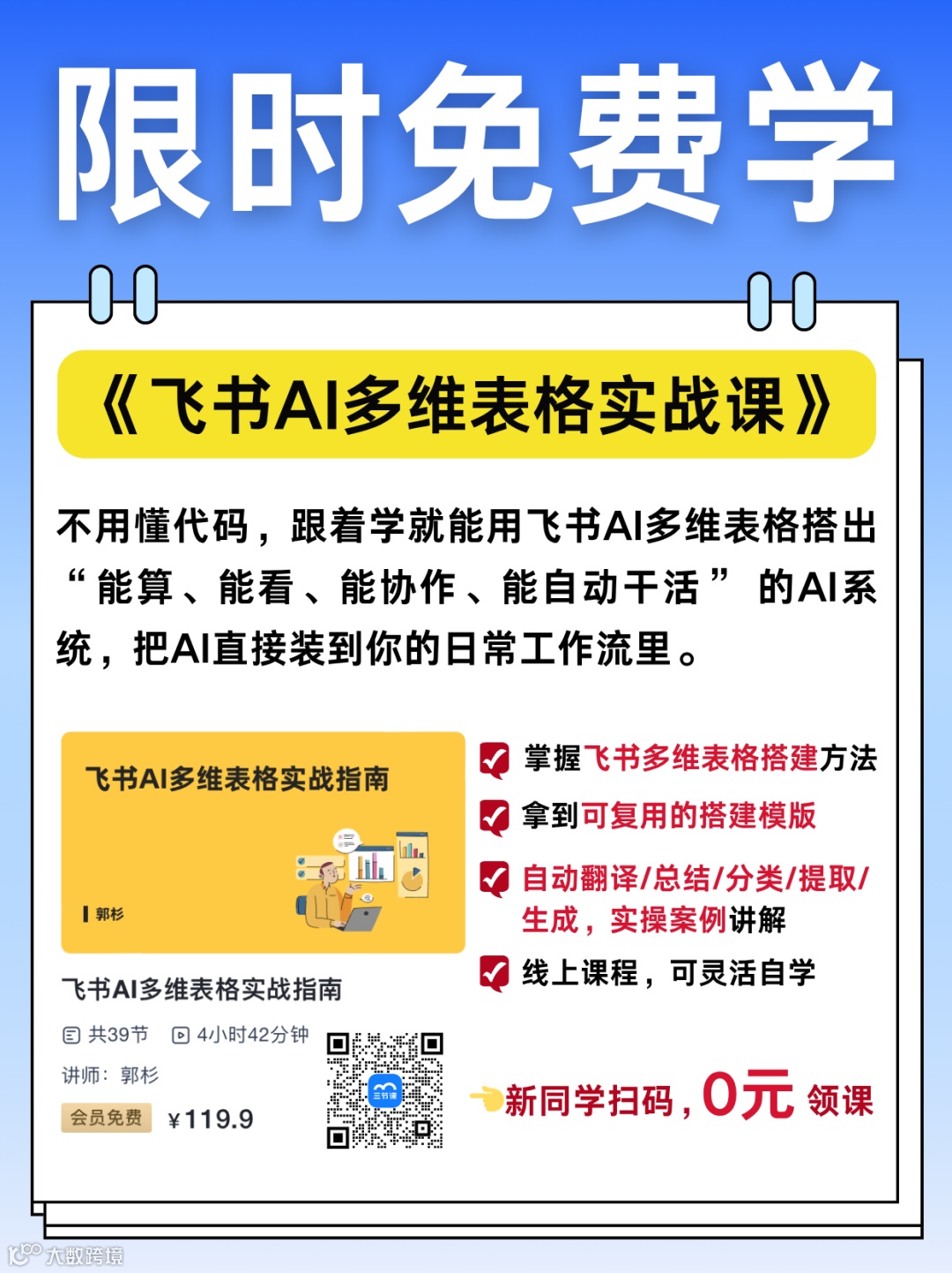 新同学立刻扫码0元领取这门课程,跟着AI应用专家玩转飞书AI多维表格!