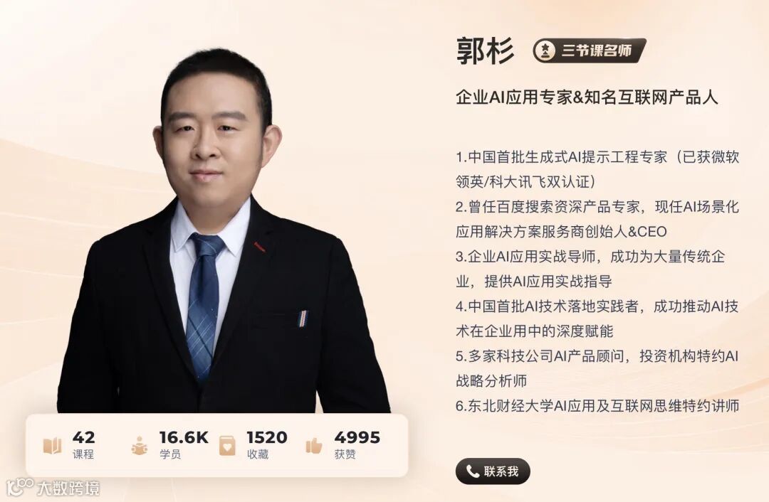 这门课程授课老师为郭杉老师,他是实打实的AI行业应用专家,成功为大量传统企业提供AI应用实战指导,目前三节课在学学员16.6K人。