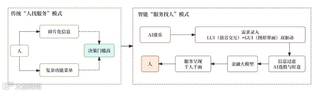 传统模式:被动搜索 -> 信息过载 -> 标准化产品; AI涨乐模式:主动感知 -> 精准适配 -> 千人千面智能,通过清晰的数据、选股逻辑等使得选股决策过程可视化,再结合数字人形象提供陪伴式服务,增强客户信任。