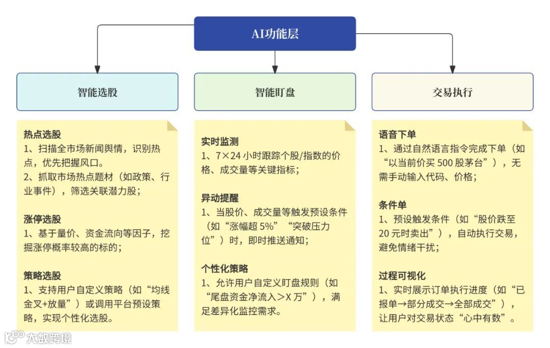 聚焦核心交易场景,提供智能化工具:围绕“选股→盯盘→交易”的核心投资流程,用 AI 技术解决用户在信息筛选、实时监控、订单执行中的痛点,是产品的核心价值载体,如下图所示: