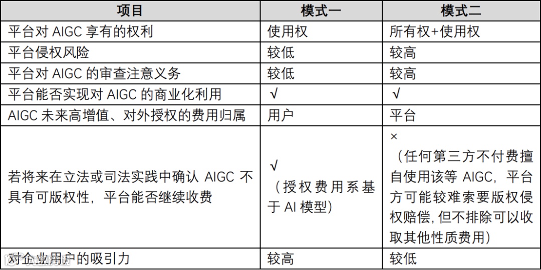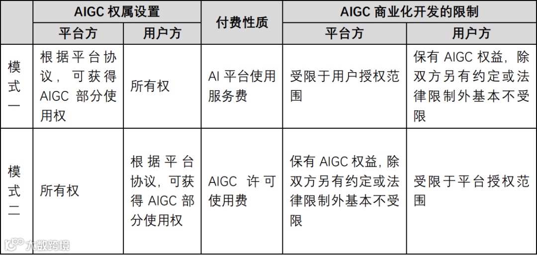(1) 平台不拥有AIGC的所有权,但可通过平台协议获取基于用户许可的对AIGC使用的权利,在许可范围上平台也可以通过协议条款自主设定,同样可实现对AIGC的商业化利用;
