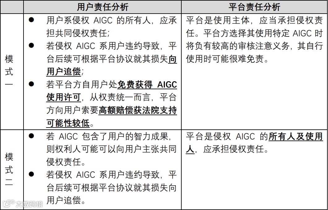 据此,在前述三种发生率较高的AIGC版权侵权纠纷场景下,不同业务模式下用户及平台可能面临以下不同责任承担情况: