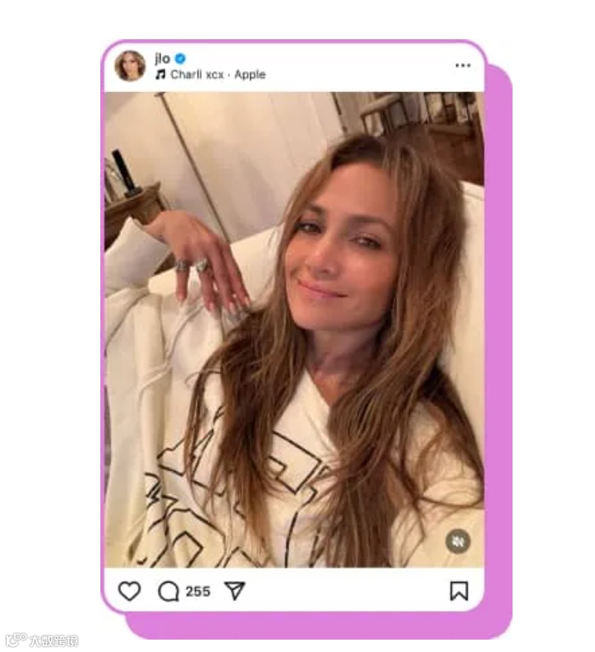 詹妮弗·洛佩兹之所以是 Instagram 上粉丝最多的人之一,源于她多元化的事业身份:歌手、演员、企业家,甚至是让 Google Images 诞生的原因。她的账号融合了华丽写真、幕后花絮和日常点滴,展示舞台上与舞台下的生活。