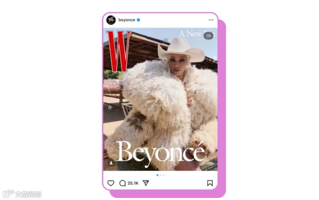 碧昂丝自然也是 Instagram 上粉丝最多的人之一,这得益于她在音乐、时尚和文化领域无与伦比的影响力。她的动态极具策划性,主要发布时尚造型、巡演现场照和杂志封面,内容风格以自拍为主。