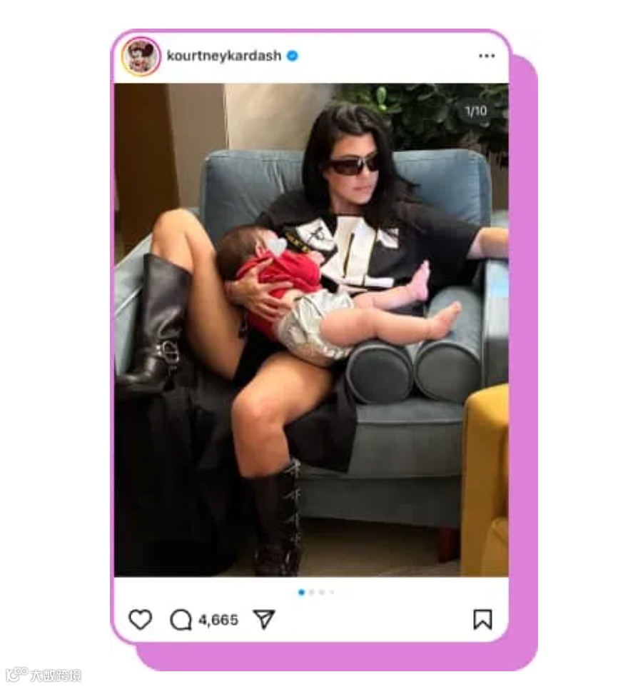 作为卡戴珊家族中最后一位上榜的成员,科特尼·卡戴珊在 Instagram 上主要分享家庭动态、穿搭体验,以及她的品牌 Lemme 和 Poosh 的推广内容。