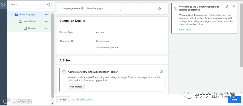 填写Campaign名称,注意:在这一步你还将看到A/B测试选项,相关内容孟老师在本文先按下不表,在后续的进阶内容中再为大家介绍。对于Facebook新手而言,A/B测试选项可以直接跳过。