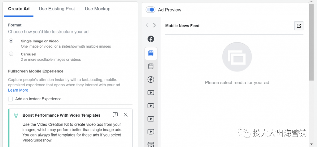 选择广告格式。选择包括单个图像、单个视频或者轮播。