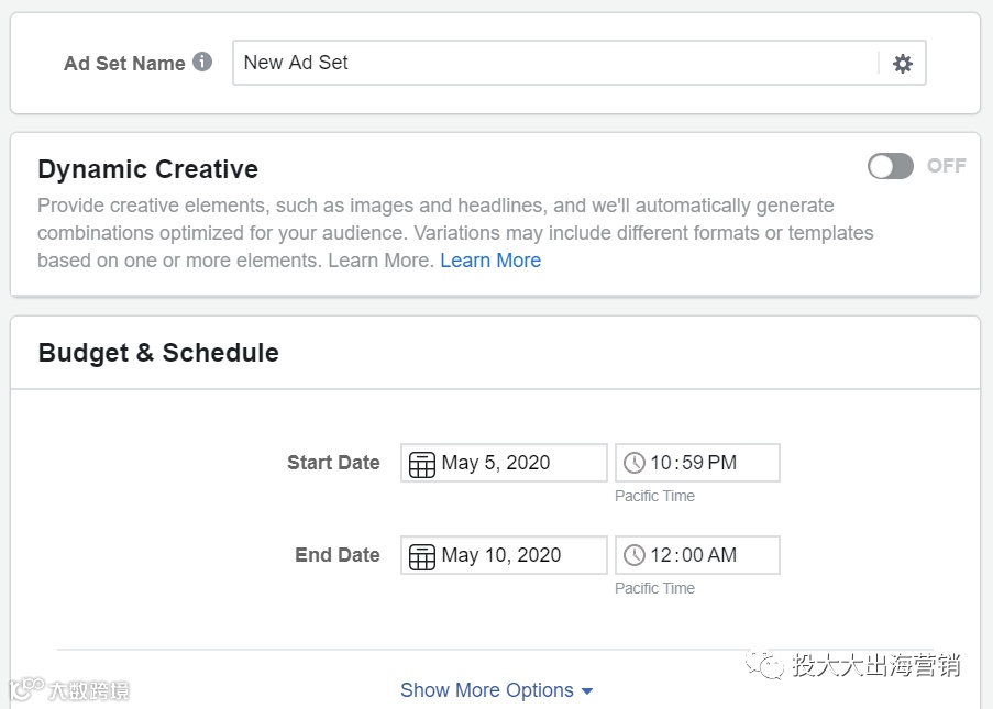 下一步开始就进入到广告组的创建了,首先需要填写广告组的名称,并设置开始和结束日期。
