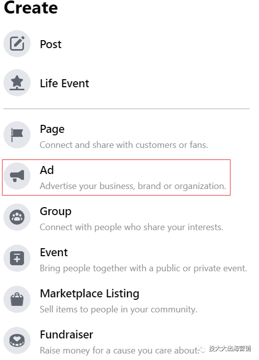 首先,你可以转到你的Facebook页面,然后点击“+”图标,选择Ad(如下图),会直接将你带到Facebook广告管理器。