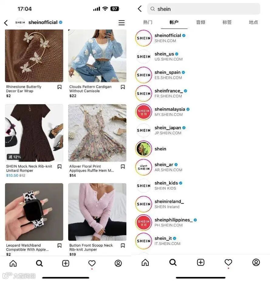 除了官方品牌账号,SHEIN还分品类、分地区设有不同的子账号,比如仅Instagram子账号就超过20个,更加有效地触达细分市场的消费者。