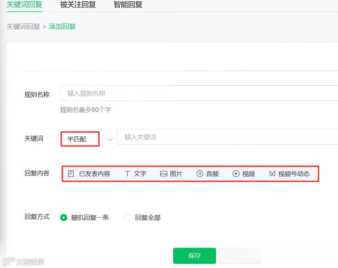 这个功能是让用户在后台发某个关键词,系统自动回复对应内容。
