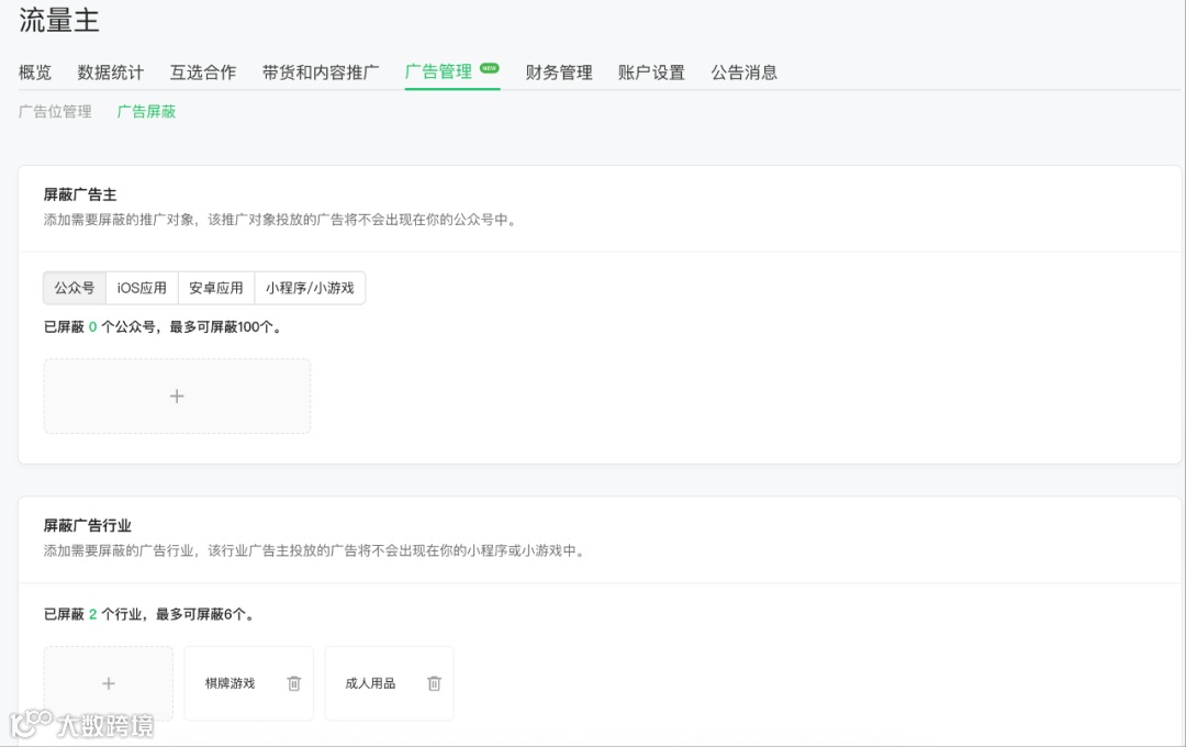 最后一个就是屏蔽掉低点击率的广告,在公众号的流量主>广告管理位置,有个广告屏蔽的选项。