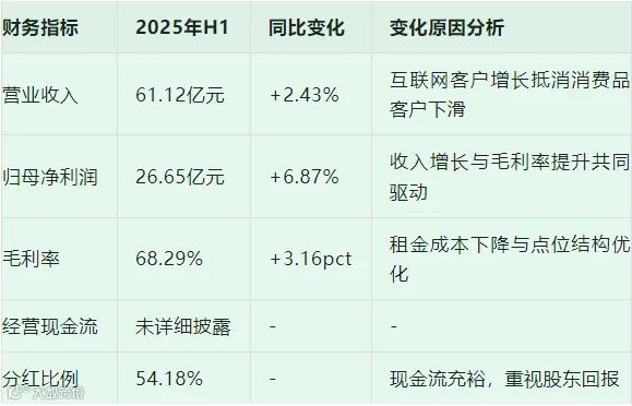 尽管2025年上半年营收增速平缓,但公司在成本控制方面成效显著,毛利率已提升至68.29%(2025年H1)。通过点位优化(例如减少低效海报点位,增加智能屏),公司营业成本得以下降,盈利能力增强。