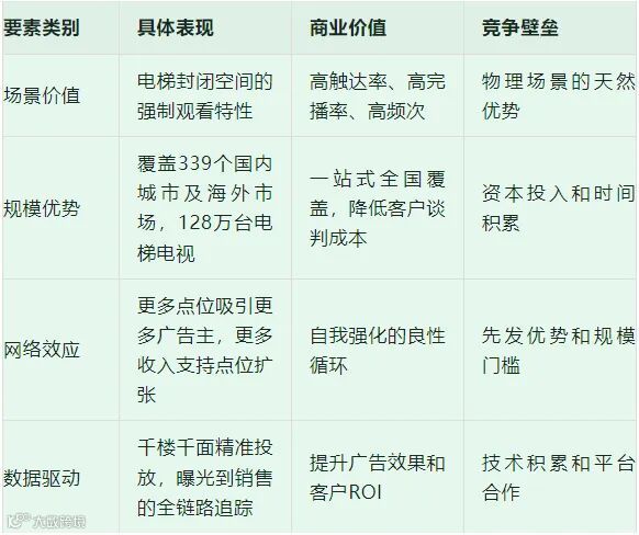 首先,分众传媒拥有规模最大、质量最高的点位网络,尤其在一二线城市核心区域的高覆盖率构筑了强大壁垒。这些优质点位资源难以复制,形成了持久的竞争优势。