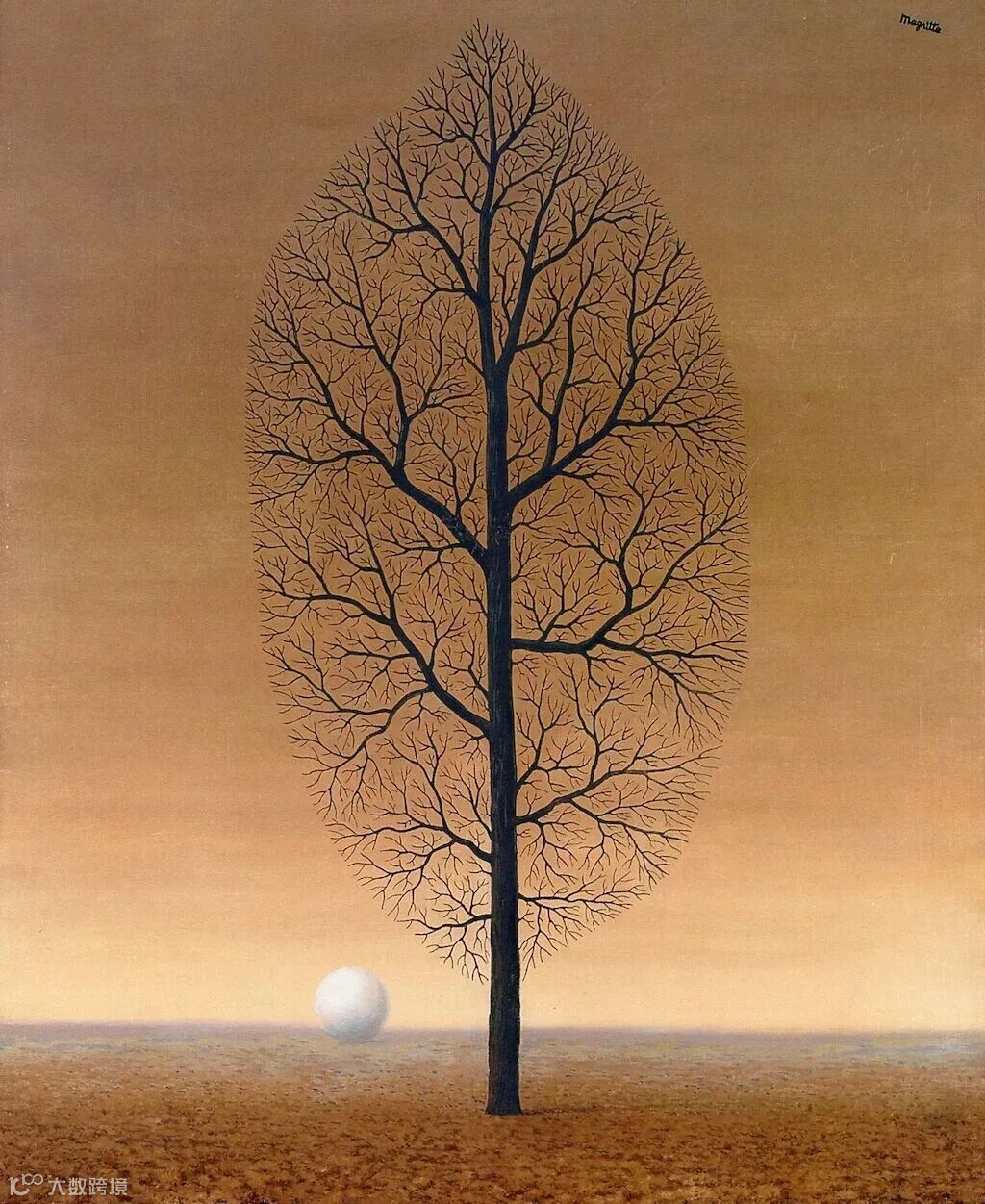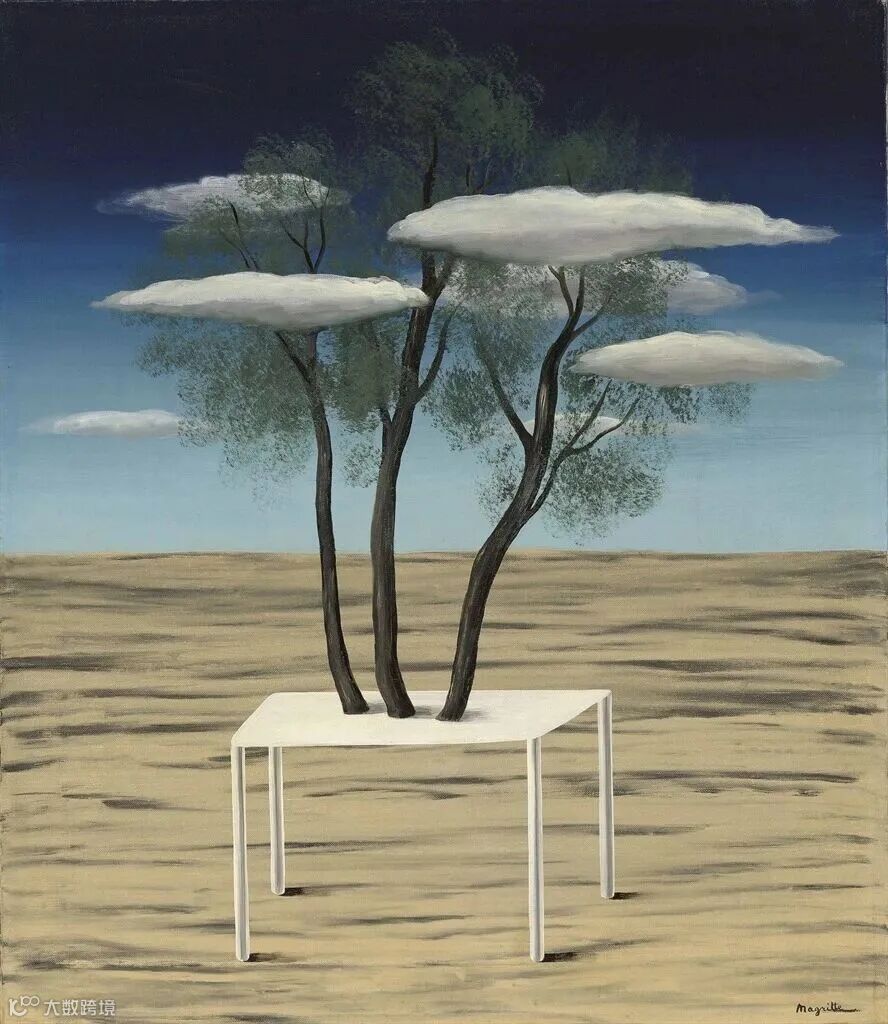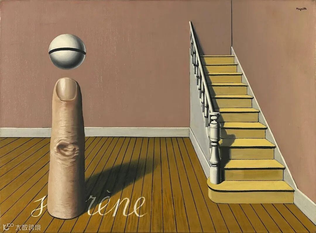 · 马格里特的经典手法是把熟悉的事物放置在不合理的场景中。苹果被放大到填满整间房间,石头漂浮在天空,火车从壁炉冲出。画面依然写实,却因为错位显得陌生。他希望“让不可见的东西变得可见”,让我们重新发现平凡事物的神秘性。这种冷静描绘与逻辑错置,构成了超现实主义的另一种可能:不是狂乱的梦,而是带着理性的谜题。