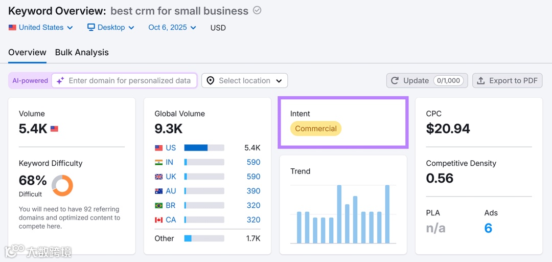 使用 Semrush 的关键字概览工具了解目标关键字的搜索意图