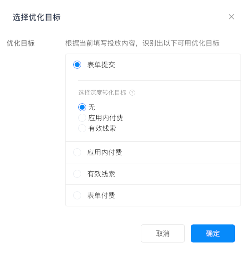 推广销售线索:按oCPC表单提交、应用内付费、有效线索、表单付费等形式,0元起竞价;CPC的0.5元竞价;