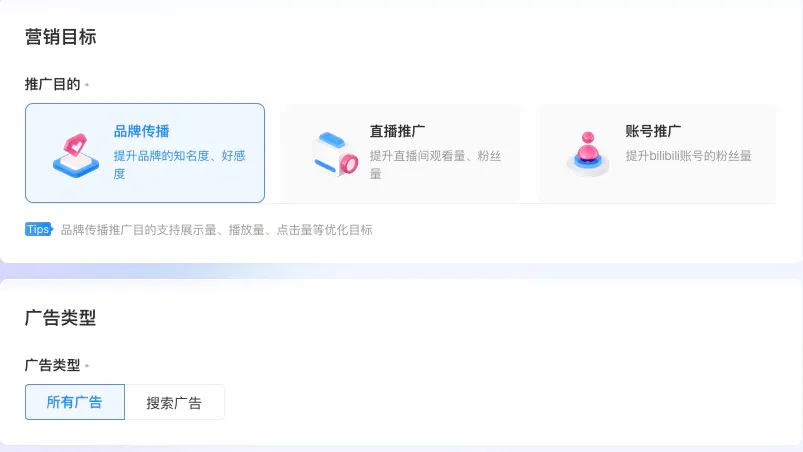三连带货端口推广目标:视频推广、账号推广、直播推广、销售线索收集、应用推广、店铺/官网推广等。