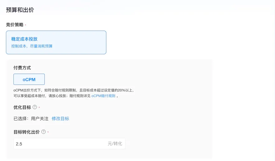 账号推广/用户关注:oCPM自然用户关注2.5元起竞价;