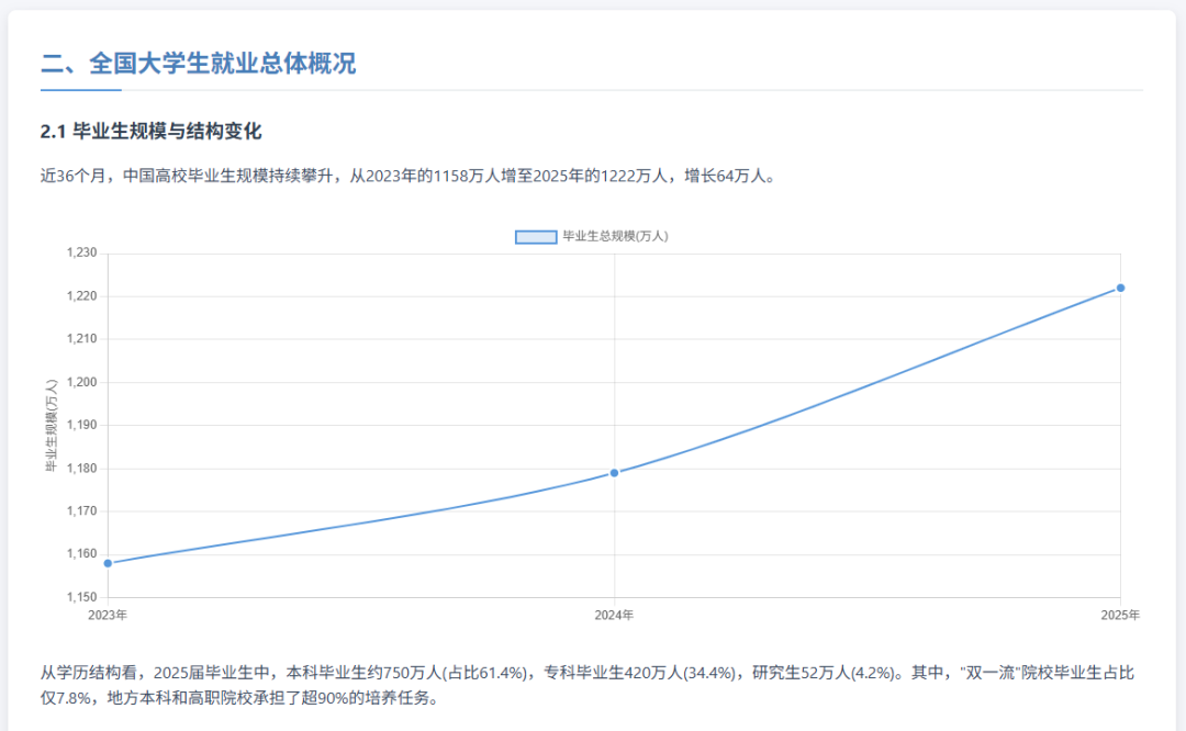 2025年,中国高校毕业生规模达到1222万人的历史峰值,较2022年增长约146万人,增幅达13.5%。这一庞大的数字背后,是教育普及化政策与社会对学历追求的双重推动。然而,毕业生规模持续扩张的同时,就业市场却呈现出明显的结构性分化,形成"就业难"与"招工难"并存的局面。