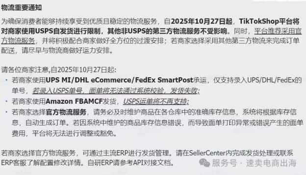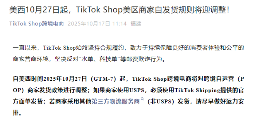 近期TikTok又宣布了一条物流新规则:自10月27日起,将全面限制跨境商家使用USPS进行自发货。