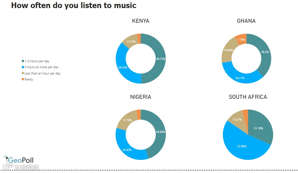 调研机构Geopoll数据显示,尼日利亚、加纳、南非和肯尼亚超过80%的受访者每日听音乐超过一小时,南非超半数用户日均收听时长超过三小时,远高于中国华语用户3小时以上仅2.7%的比例[k]。