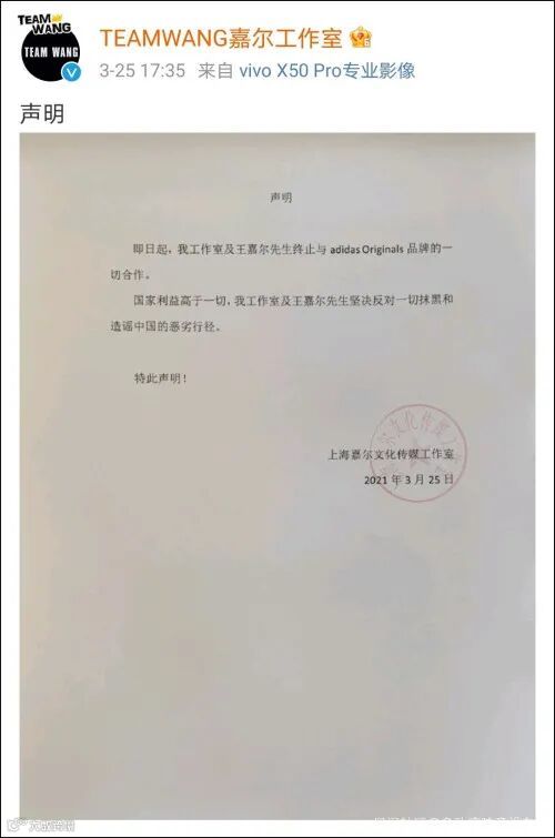 身为阿迪达斯代言人的王嘉尔于25日下午通过工作室发表声明,宣布终止与阿迪达斯的一切合作,并表态国家利益高于一切,坚决反对一切抹黑和造谣中国的恶劣行径。