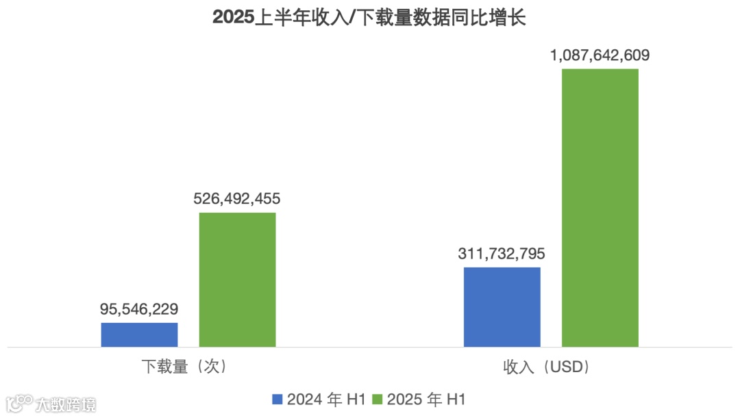 2025 年上半年,海外短剧整体收入10.88 亿美元,同比暴涨 249%;下载量累计5.26 亿次,同比疯涨 451%。什么概念?去年同期还在 “千万级收入” 挣扎的赛道,今年直接跳级到 “10 亿俱乐部”,相当于每天进账近 600 万美元。