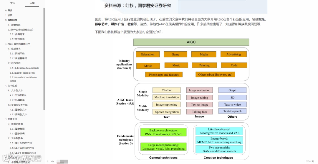 本文将 AIGC 视为一组使用人工智能方法生成内容的任务或应用程序。其中,生成技术是指使用机器学习模型生成新的内容,例如 GAN 和扩散模型。创作技术是指利用生成技术生成的内容进行进一步的创作和编辑,例如对生成的文本进行编辑和改进。