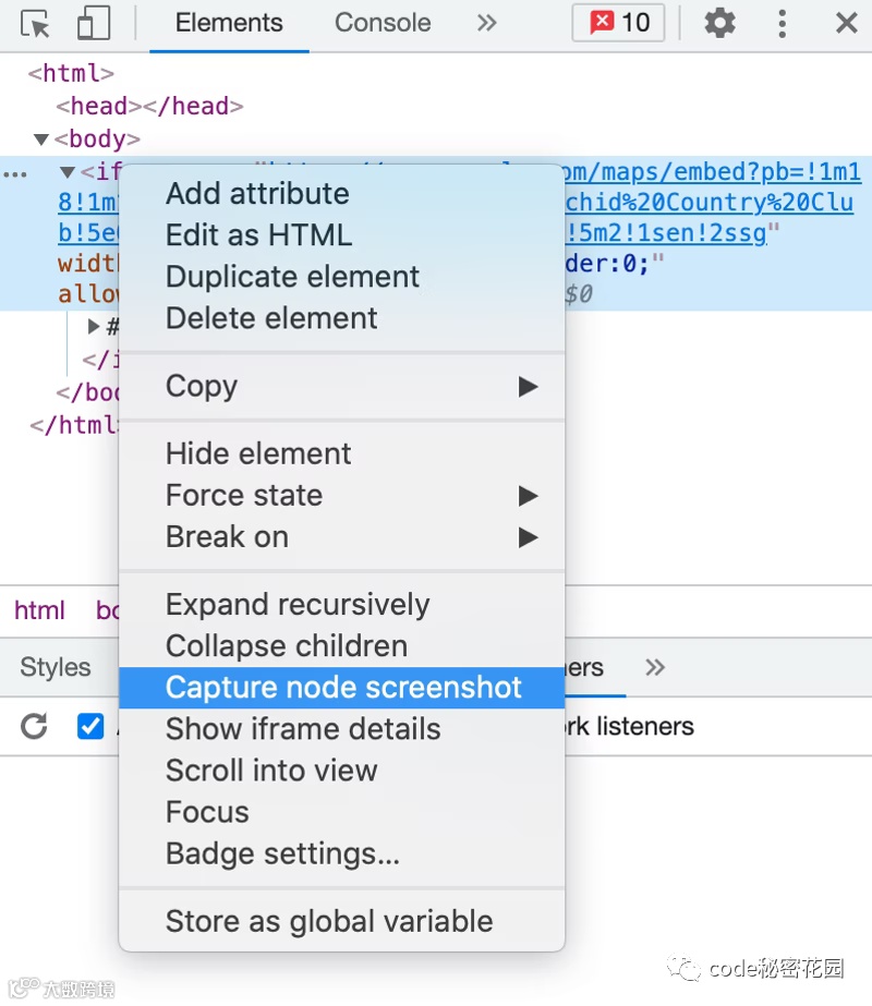 你可以使用 DevTools 的节点屏幕截图工具来截取 iframe 的屏幕截图: